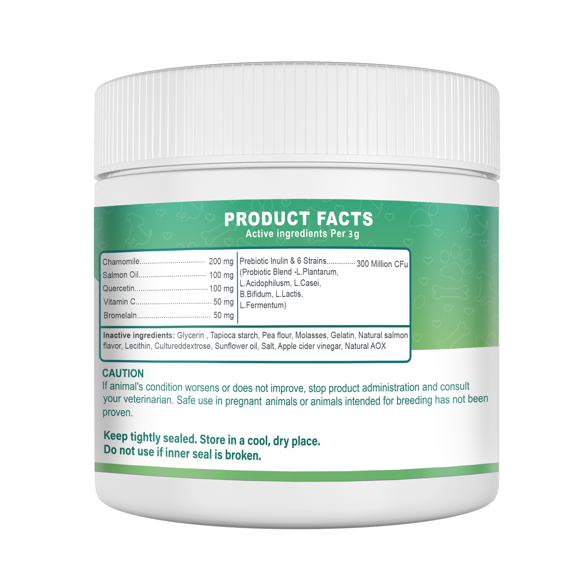【Powerful Allergy Defense & Fast Itch Relief】 Formulated with Quercetin (nature’s antihistamine) and Bee Propolis (300+ antioxidants), this vet-approved powder tackles relentless itching, paw licking, and seasonal allergies at the root. The 6-strain probiotic blend (including L. Acidophilus and B. Bifidum) calms overactive immune responses, while Bromelain reduces inflammation for visible relief within 2-4 weeks. Perfect for dogs suffering from environmental triggers, food sensitivities, or chronic skin irritation