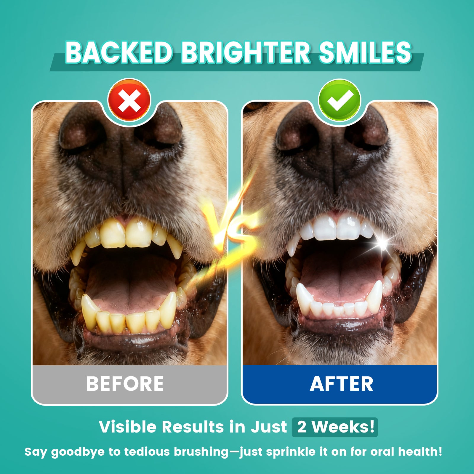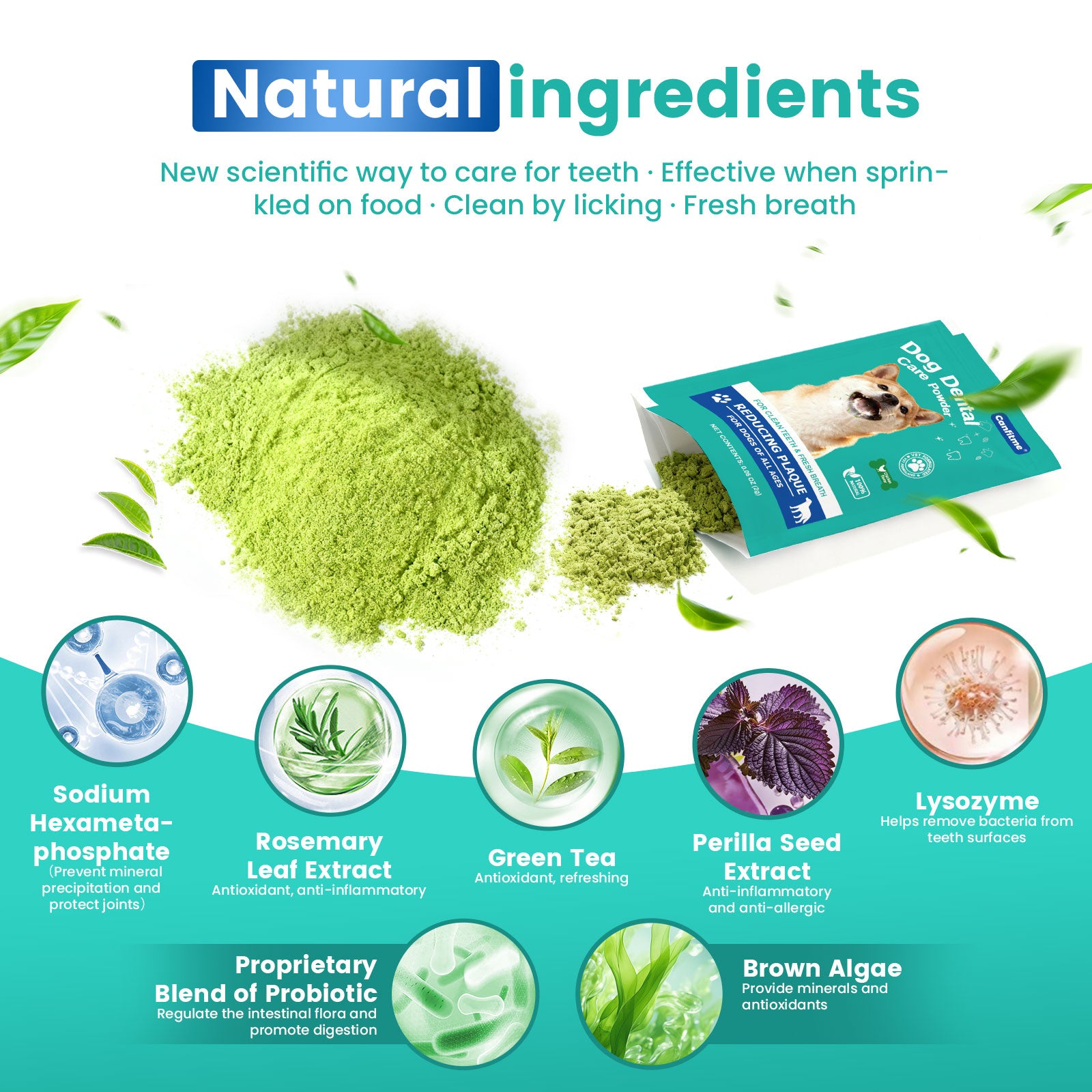 • Healthy Ingredients: Our dental powder for dogs teeth is made with a variety of natural ingredients that contribute to your pet's dental health. Probiotics neutralize bacteria that cause gingivitis and bad breath, Brown Algae helps reduce plaque and tartar buildup.