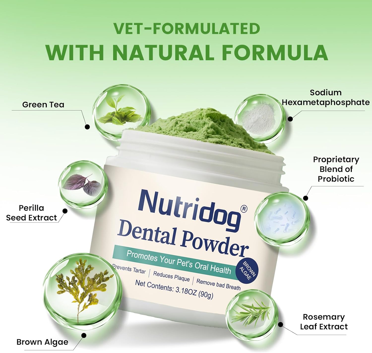 • ADVANCED PROBIOTIC & BROWN ALGAE DENTAL CARE : Nutridog Dental Powder combines 6 targeted probiotics with North Atlantic brown algae to actively break down plaque biofilm. Clinically tested to reduce tartar by 37% in 28 days, this dog teeth cleaning powder supports a balanced oral microbiome without brushing. The ultimate plaque remover for dogs works naturally through saliva during meals. An effective dental powder for dogs teeth that promotes overall oral health