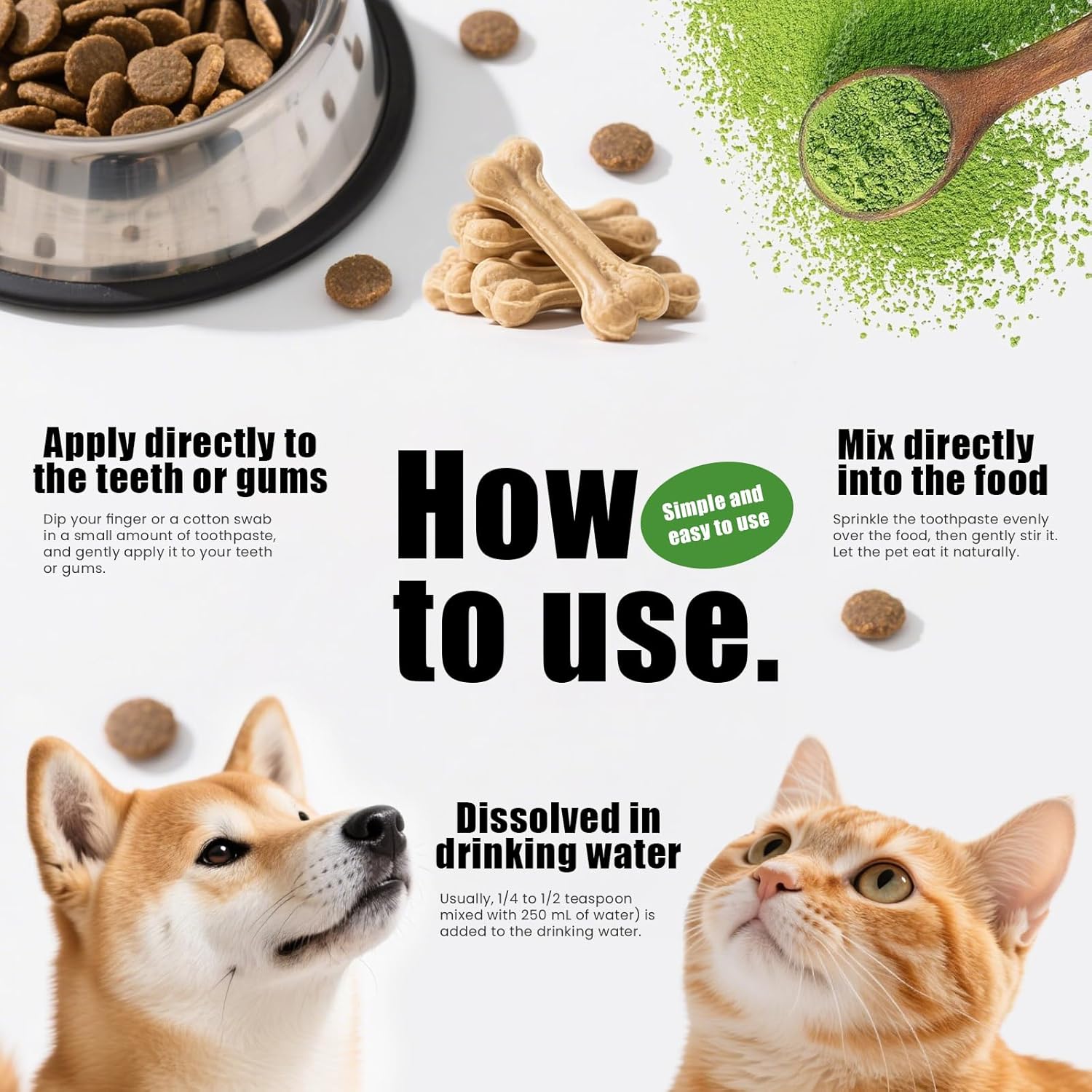 • CUSTOMIZED FOR ALL DOGS & MULTI-PET HOMES : Precisely dosed for dogs 4lbs–100lbs+, with perilla seed extract to soothe senior dogs’ gums and prevent puppy plaque. Our dog dental powder is gentle enough for cat teeth cleaning, offering versatile dogs teeth care for households with multiple pets. Adjustable dosing ensures perfect oral care for every size and age